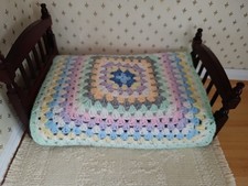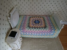 Traditional style multicoloured crocheted blanket in pastel shades for a single bed made using 1ply yarn and a very fine hook.