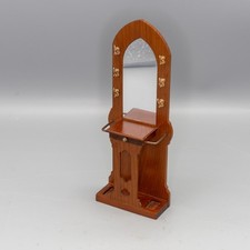 A 1/12th scale dolls house Escutcheon hall stand, made of wood, it features a mirror six coat hooks a small shelf and an umbrella /stick stand to each side, in good pre owned condition.