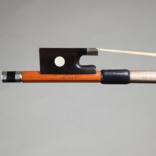 The round stick follows the model of the French master Dominique Peccatte and is made from beautiful, select grade orange Pernambuco wood. The frog is ebony fully mounted in German silver, decorated with a large pearl eye.