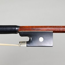 Round stick is made from beautiful burgundy-red Pernambuco wood. The frog is ebony, fully mounted in German silver. Stick: select Pernambuco; round shape, elegantly cut. This was made in the 2000 and is in good gently used condition (there is no visible wear on the thumb leather or the silver tinsel thread; the hair is ample).