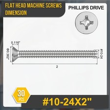 Product Details:•Color: Silver•Material: 304 stainless steel•Size: #10-24x2";•Screw Type: Phillips Head•Package Content: 30pcs x Flat Head ScrewMaterial - Made of 304 stainless steel, corrosion-resistant and rust-resistant, durable in harsh environment for long-time use.Feature - Flat top/ countersunk top, suitable to fasten equipment which needs to sit flush with the good appearance surface. Clear Phillips cross groove, ensure fully engage with screwdriver and avoid slippage. Smooth, and accurate threads, easy to install and improve tightness.Application - Fasten, install and maintain household appliance like electrical outlet, switch, wall plate, furniture, woodworking, and other machine maintenance in electrical industry, marine industry etc.Notice - Recommend to guide the cross grooved screw slowly locked to avoid thread slippage.