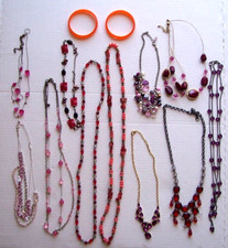 For Sale is a beautiful lot of 10 necklaces and 2 bangle bracelets in good wearable condition. They are a variety of lengths, styles and metals made with beads, rhinestones, dangles and stones. They have secure lobster closures. Colors include: red, pink, coral, purple, and more. Some are vintage. Can also be used for crafts. Please see photos. They would make a great addition to your jewelry collection or as gifts. Think Valentine's Day. Thank you for looking.