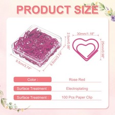 Questo set di fermagli di metallo a forma di cuore è progettato per migliorare organizzazione e stile. Ideali per uffici o case, i fermagli aggiungono un tocco decorativo fissando in modo sicuro documenti, lavori artigianali o foto. Usali come segnalibri, decorazioni per album o abbellimenti per regali per un appeal versatile.Specifiche:Colore: Rosso Rosa;Materiale: Metallo; Superficiale: Rivestimento In Plastica;Forma Fermagli: Cuore;Dimensioni Fermagli: 25 x 30mm / 0.98 x 1.18 pollici (L*P);Dimensioni Scatola: 9.5 x 9.5 x 2.5cm / 3.74 x 3.74 x 0.98 pollici (L*P*H);Lista Imballaggio: 100 x Fermaglio, 1 x Scatola Di PlasticaVantaggi:Realizzati in metallo con rivestimento, questi fermagli resistono alla ruggine, garantendo un uso a lungo termine.
