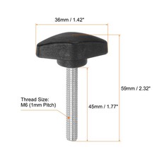 Specifications:Standard Thread Size: M6 (1mm Pitch)Thread Length: 45mm / 1.77"Tee Wing Head Width: 36mm / 1.42"Total Length: 59mm / 2.32"Knob Style: TeeMaterial: Carbon Steel, PlasticFinish: Zinc PlatedColor: BlackPackage Content : 10pcs x Tee Wing Knobs Thumb ScrewsDescriptions:Zinc plated carbon steel threaded studs on T knobs ensure durability, strength, functionality and wear resistance. Premium plastic clamping knobs provide durability, a smooth surface and comfortable grip. Sturdy and durable thumb screws for the ultimate in adjusting and tightening control.The tightly-in metal insert are machine-injected at high temperatures to securely connect the parts together, easy to install. T wing knobs are easy to grip and turn by hand, providing leverage and comfort, making it easier to tighten or loosen the knob.