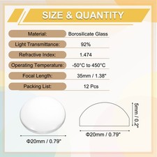 This flat convex is applicable to LED spotlights, car lights, focusing flashlights, projection lights, explosion-proof lights, down lights, and other lighting products. Suitable for reading small text in newspapers, books, menus, or labels, these lenses serve as versatile tools for science experiments, DIY telescope projects, or office tasks.Specification:Color: Clear;Material: Borosilicate Glass;Light Transmittance: 92%;Refractive Index: 1.474;Operating Temperature: -50°C to 450°C;Focal Length: 35mm / 1.38 inch;Outer Diameter: 20mm / 0.79 inch;Height: 5mm / 0.2 inch;Packing List: 12 x Convex LensAdvantage:Convex lenses are made of borosilicate glass, which is more resistant to high temperatures, has higher strength, and higher light transmittance than other materials, ensuring scratch resistance and long-term use.