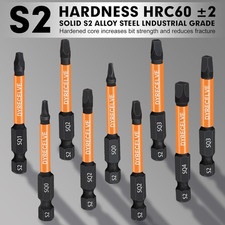 CNC SECURE FIT TIP Square drill bit set standard size enables deep fit in screw head recess for reduced cam-out and enhanced torque. S2 ALLOY STEEL Square drive bits adopt solid S2 alloy steel, industrial grade hardness HRC60±2, hardened core increases bit strength and reduces fracture.