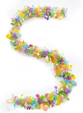 Spring tinsel garlands showcase a rainbow gradient design adorned with high-saturation sequins, and are surrounded by Easter eggs of different colors, making the overall combination well-suited to the color tones of spring.