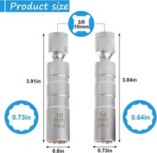 Magnetic Spark Plug Socket Set – 14mm & 16mm. Item model number 14mm+16mm 4". This 3/8" driver socket set has a 12-point design with a special bump pattern for a secure grip, making spark plug removal easier and safer.