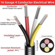 16 AWG 4 Conductor Electrical Wire Stranded PVC Cord - 50ft 12V Low Voltage