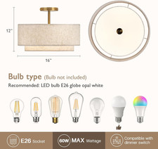 16" Double Drum Gold 3-Light Semi Flush Mount Ceiling Light, Classic Fabric Line
