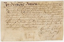 Part manuscript, cut down without seal. &c. Nos supradictus ministri testantes perhibemus universis et singulis quorum interest Johanne Lawrence [?]. superiecte [?]. Fr̃is D̃ni Tho: Wood vicarii et D̃ni Richardi Warde dominorum Ebor’ Archidiac’ iurisdiccionis in hac parte limitatorum [?].