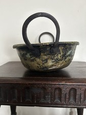Antique 18th or early 19th century American hand forged, iron handled, brass rolled rim hearth cooking pot. It measures 10” in circumference; handle to handle 12 1/2” and is 4” in depth. There are a few very minor cracks but in great condition for its age. Rare and one of a kind. Being sold as is.