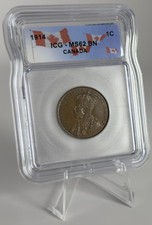 1914 Canada George V 1 Cent Small Cent. Graded by ICG as MS62 BN (Brown). 95% Copper. Royal Canadian Mint.