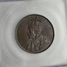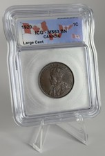 1920 Canada King George V Large Cent 1 cent. Large King George Bust high value variety. Graded by ICG as MS63 BN (Brown). 95% Copper. Royal Canadian Mint. A nice beautiful well struck coin with nice details and original luster shining through toning.