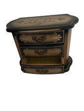 This 1960's musical jewelry box with 3 drawers and faux brass inlays features a vintage style with a burlwood finish and floral pattern. Handmade in Japan; this dresser is adorned with hand-painted details and a brass handle to add a touch of elegance. The compact size of less than 30 inches in length and height makes it perfect for a bedroom setting, while the music-themed design adds a nostalgic touch to any space. This unique piece of furniture combines functionality with a touch of French era charm. It measures 8.5" W and 7.5" H. To clean, use a very mild damp cloth. Avoid harsh chemicals, as old varnish can become "alligatored" (cracked) or cloudy if it gets too wet or is exposed to solvents.