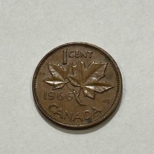 This item is a 1966 Canadian one-cent coin, featuring a maple leaf design on the reverse. Composition: Bronze (98% copper, 0.5% tin, 1.5% zinc). Weight: 3.24 g. Diameter: 19.05 mm. Mintage: 227,244,069.