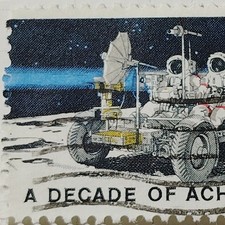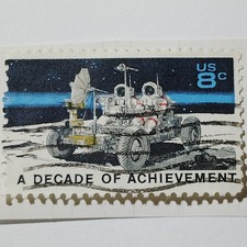 No. 1: Item DetailsYear: 1971. Scott No. 1435. Condition: Used and Canceled (as shown in provided photo). No. 2: Historical ContextThis stamp honors the first decade of the U.S. space program and specifically the Apollo 15 mission, which saw the debut of the Lunar Roving Vehicle.
