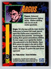 This 1993 SkyBox DC Bloodlines card #57 features Argus, the man with the triple identity. Artwork by Phillip Hester and Aaron McClellan. A fantastic collectible for DC Comics Bloodlines fans.