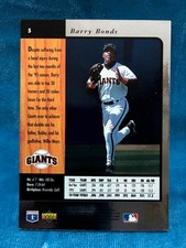 The product is a 1996 Upper Deck SP Barry Bonds #5 All-Star Game Promos trading card featuring the player from the San Francisco Giants. This original card is part of the 1996 SP set and is made of card stock with a 20 Pt. thickness. It is a promo card with the All-Star Game Promos variety, and it is not autographed. The card is in English and was manufactured by Upper Deck in the United States.