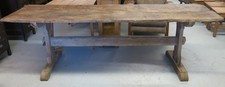 Ca. 1880 This Rustic Antique Two-Plank Trestle Refectory Table is a classic example of traditional craftsmanship, characterized by its massive scale and functional simplicity. Historically, such tables were used in monastery dining halls, or refectories, where their long, narrow design accommodated groups of people. Please see photos for condition details as the pictures are considered a part of the description.