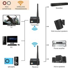 1Mii 2.4Ghz (1 TX + 1 RX) Wireless Audio Transmitter Receiver for TV, 320ft Long Range 20ms Low Delay HiFi Audio, Wireless Adapter Kit for Powered Speaker/Stereo/Soundbar, RCA(3.5mm AUX) Out/Input. With the help of a cable, this device may carry a signal from a transmitter attached to an audio source to a receiver that is linked to a powered speaker, mixer, or amplifier.