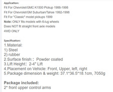Application: Fit For Chevrolet/GMC K1500 Pickup 1988-1998 Fit For Chevrolet/GM Suburban/Tahoe 1992-1998 Fit For "Classic" model pickups 1999 Note: ONLY fits models with 6-lug wheels Does NOT fit straight front axle models 4WD ONLY Specification: 1.Material: 1) Steel 2) rubber 2.Surface finish::Powder coated 3.Lift Height:2-4" Lift 4.Placement on Vehicle: Front, Upper, left, right 5.Package dimension & weight: 37.1*36.5*18.1cm, 7050g Package included: 2* front upper control arms Feature: 1. Zert fittings for easy lubrication. Ball joints come with 90-degree zerk fittings. 2. Harder and durable because they are made of machined steel alloy and painted with industrial powder coating 3. Eliminates tire wear while improving stability 4. Improves Rear Suspensi.