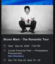 This product is a pair of lower level tickets for Bruno Mars' romantic tour in Philadelphia in September 2026. Bruno Mars is known for his rock, pop, and hip hop music, and the concert will be held at Lincoln Financial Field in the city of Philadelphia, Pennsylvania.