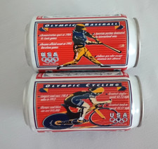 2 Budweiser empty aluminum 12 oz. beer cans depicting the Olympic sports of baseball and cycling. Empty cans with holes in the base to drain the beer. Minimal wear to graphics.