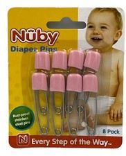 16 Toal Nuby Pink Diaper Pins Our Diaper Pins feature a plastic safety-lock head with a rust-proof stainless steel pin. This attention to detail provides a quality product that is safe and durable. Features & details Diaper pins feature a plastic safety-lock head closure Stainless steel pin is rust-proof Four safe and durable pins that will last BPA Free Material: Stainless Steel and Plastic Meets CPSC Requirements New inside the original packaging The cardboard has some bending Please see our pictures