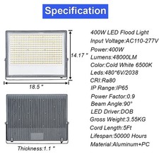 [IP65 WATERPROOF High Quality]: This 400W LED Flood Lights is 120lm/W High Brightness IP65 suitable for both dry (indoor) and wet(outdoor) environments for a 50000 hours lifespan . [48000Lm High Brightness]: This Floodlights brightness is several times higher than traditional light bulbs,you can save up to 70% electricity. [ Wide Application]: The LED Floodlights are widely used in outdoor lighting like gardens, squares, billboards, factories, docks, stadiums and other places where Large Area Illumination is needed. [EXCELLENT HEAT DISSIPATION] : This Outdoor Flood Lighting 400W is made of die-cast aluminum design Radiator, provide an excellent heat dissipation and extend the life of lamp bulbs. [WIDE BEAM ANGLE 90° ] [ Easy Installation]: Ground Mounting,Ceiling Mounting,Wall Mounting.