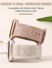 Includes two floral engraved bands for variety. Compatible with Apple Watch Band sizes 38/40/41/42/44/45/46/49mm. Compatible with iWatch Series 11, 10, 9, 8, 7, 6, 5, 4, SE, and Ultra 3, 2, 1. Features a cute sunflower design for a stylish look.