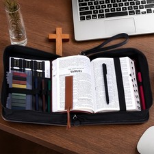 Waterproof Leather Material: Made of waterproof leather, the cover fends off light rain or accidental splashes during use. The smooth-running zipper opens and closes effortlessly, ensuring quick access to your Bible and included study supplies, such as colorful pens, gel pens, Bible tabs, index tabs, and bookmarks.