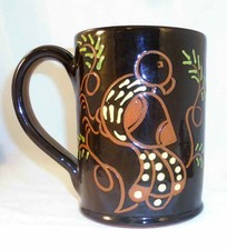 2000 Breininger Large Glazed Sgraffito Decorated Mug Brown Bird Black Background
