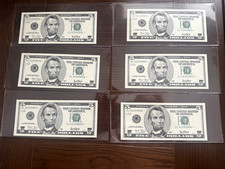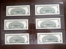 Crisp uncirculated $5 Federal Reserve Notes from 2001, 6 Consecutive Notes in excellent condition