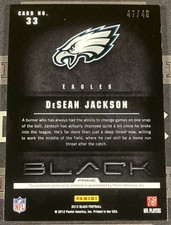 The product is a 2012 Panini Black DeSean Jackson Reebok Laundry Tag Patch trading card, numbered out of 49. This football card features a piece of memorabilia from DeSean Jackson's Philadelphia Eagles jersey, making it a unique and collectible item for fans of the National Football League. The card is part of the 2012 Panini Black set and is a parallel variety with a laundry tag design, adding to its rarity and appeal to collectors of sports trading cards.