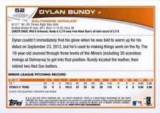 This is a nice example of a 2013 Topps Opening Day #52 Dylan Bundy Other important information about this card: RC In 2013 Dylan Bundy played for the Baltimore Orioles. Please check out our other listings for more great cards.