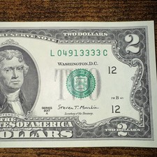 2017 $2 Bill Fancy Serial L04913333C – Quad 3333 – Crisp Uncirculated Note