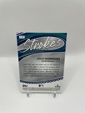 The 2024 Topps Chrome Strokes Julio Rodriguez #S-18 trading card is a sought-after collectible for baseball fans and card enthusiasts. Manufactured by Topps, this insert card showcases the talented player Julio Rodriguez from the Seattle Mariners. As part of the Strokes insert set, this sports trading card offers a unique design and is a valuable addition to any collection focusing on Major League Baseball memorabilia. With its distinctive parallel/variety and specific card number, this card is sure to be a prized possession for fans of the sport.