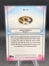 The 2025 Bowman's Best University - Bowman Showpieces Beau Pribula #BS-19 sports trading card is a rookie insert featuring football player Beau Pribula from the Missouri Tigers. This card is part of the Bowman Showpieces set by Topps, specifically designed for the National Collegiate Athletic Association (NCAA) league. With a near mint condition, this collectible card is a valuable addition for sports card enthusiasts looking to add to their collection.