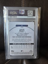 The product is a 2025 Topps Finest Common Austin Riley Purple Refractor trading card numbered out of 250. This baseball card features the Atlanta Braves player and is part of the Major League Baseball set. It is a serial numbered insert with a parallel variety, graded as a 7 by Professional Sports Authenticator (PSA). The card is made of card stock and is an original release by Topps for the 2025 season.