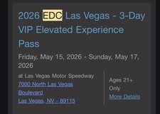 Please note*****Item will be overnighted upon arrival to buyer****** Please see other sales on my page if you are concerned about security or authenticity. If you have any questions or concerns do not hesitate to ask. This is for 1 ticket, thank you! ******* The 2026 EDC Las Vegas - 3-Day VIP Elevated by Experience Pass is a highly coveted ticket for music festivals and fairs enthusiasts. With access to exclusive VIP areas and elevated experiences, this pass offers a unique opportunity to immerse oneself in the vibrant culture of EDC at the Las Vegas Motor Speedway. Attendees can enjoy three days of unforgettable performances, innovative installations, and world-class DJs in a multicolor environment, making this event a must-have for music lovers and experientialists alike.