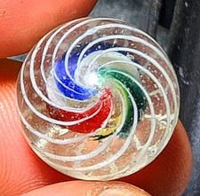 ONE EARLY FACETED TOTALLY GORGEOUS SUPER WELL MADE PRECISION CAGED BOLD COLOURED TRIPLE DIVIDED CORE ENGLISH STYLE GERMAN HANDMADE ANTIQUE MARBLE. WITH THREE INNER BOLD AND BRIGHT DIVIDED RIBBONS WHICH ARE SURROUNDED BY A PRECISION CAGED OUTER LAYER OF TWELVE WHITE LATTICE STRANDS WHICH ARE EVENLY SPACED APART AND IS SUPER WELL MADE FOR SURE, BEAUTIFUL EXAMPLE, ALL IN A CLEAR BASE GLASS.