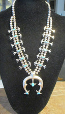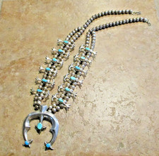 23" Old Navajo Sterling Turquoise Fleur de Lis Sandcast SQUASH BLOSSOM Necklace