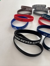 This product is a set of 23 pc lot silicone bracelets featuring various Christian Bible verses. Made in the United States, these wristbands are designed for those who practice Christianity and want to wear a reminder of their faith.