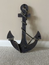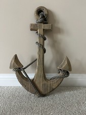 This auction is for a decorative ship anchor that measures 24" tall by about 17" wide. It is a tan color with gray accents. There are two hooks ok the back to hang it. I believe it is resin made to look like wood.