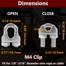 HEVER 24PCS 3/16" M4 Stainless Steel Wire Rope Cable Clip Clamp. 24pcs M4 Stainless Steel Cable Clip. Designed to couple together two lengths of wire rope, or to form an eye or loop on wire rope.