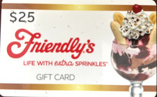 This is a physical gift card with $25 available for the restaurant Friendly's. Selling at a discount as there is no local restaurant for me to go to where I live.