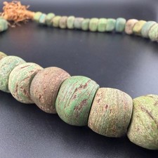 Antique Hebron Kano beads, green glass strand, approximately 27 inches long. These ancient tribal trade beads are roughly 200 years old, featuring a rustic, weathered texture and earthy green hues. Each bead ranges from 12mm to 22mm in size. Due to their age and history as African trade beads, they show natural wear, surface pits, and unique variations in shape. Perfect for collectors or unique jewelry design. Used condition consistent with ancient artifacts.