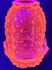 Green vaseline glass 2 piece Fairy lamp. It glows under black light. There are 12 pictures under a black light and 12 pictures under a natural light so that you can see it both ways.
