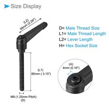 Attributes:* Male Thread Size: M8 (1.25mm Pitch)* Male Thread Length: 80mm ( 3.15")* Lever Length: 58mm (2.28")* Hex Socket Size: 4mm (0.16")* Material: Aluminum Alloy, Carbon Steel* Finish: Spray Coating, Black Oxide* Color: BlackWhat Is Included:* 2pcs x Clamping Lever HandlesApplications & Features:--- Adjustable clamping lever handles provide a secure grip and quick adjustments for applications requiring frequent and quick adjustments or working in tight areas. Widely used in lathes, drill presses, sawing machines, milling machine fixtures, packaging machinery, printing equipment, woodworking machinery, mechanical equipment, instrument and industrial equipment.--- Lightweight aluminum alloy handles offer excellent strength, corrosion resistance, and long service life.